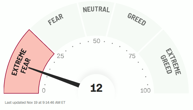 Right now we’ve got a crazy low Fear & Greed Index number. As you can see, it’s sitting firmly inside the Extreme Fear zone. The market is worried about a bubble popping, a recession starting, and they’re nervous.